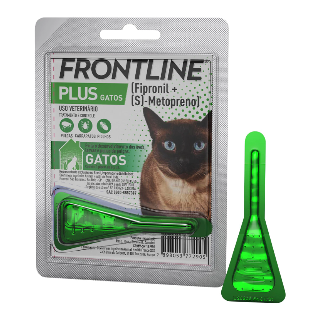 O Frontline Plus Gatos é recomendado para o controle de infestações por pulgas, carrapatos e piolhos. Seu grande diferencial é a combinação de Fipronil e (S)-metopreno, que age nas várias fases de desenvolvimento das pulgas, combatendo também ovos e larvas.